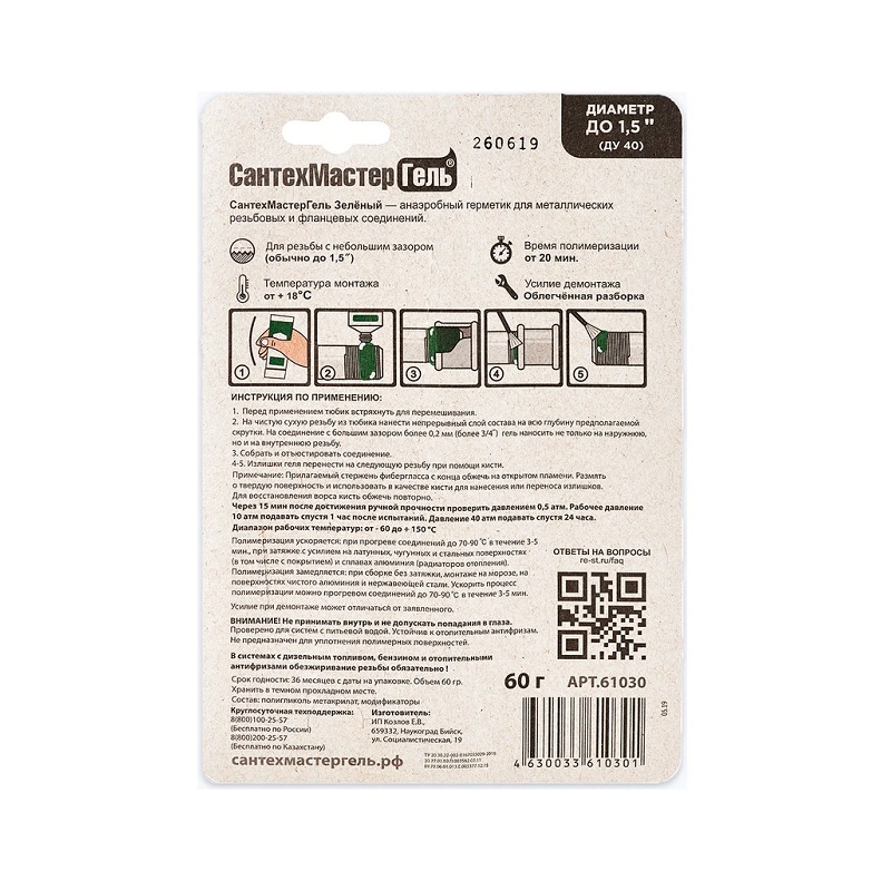 Анаэробный клей-герметик Сантехмастергель до 1 1/2" зеленый, 60 гр в Москве
