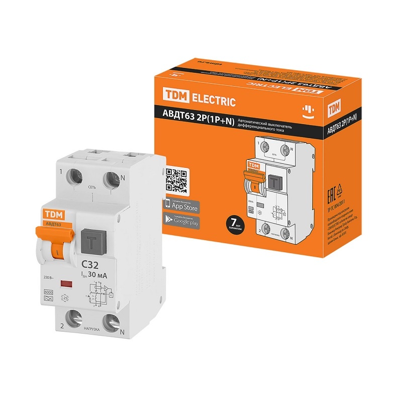 Автомат дифференциальный TDM АВДТ 63 6 кА, С 32А, 30 мА, тип А, 1P+N