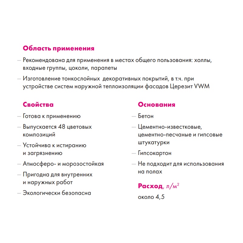 Может использоваться в системах фасадных теплоизоляционных композиционных (СФТК) с теплоизоляционным слоем из пенополистирольных плит (Церезит VWS). Возможно ограниченное применение в СФТК с минераловатным утеплителем Церезит WM на основаниях с низкой паропроницаемостью (не более 10% от общей площади фасада) при строгом соблюдении условий отсутствия намокания утеплителя.