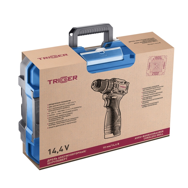 Дрель-шуруповерт Trigger 20130, бесщеточная, 14,4V, 10 мм, 48 Нм, 2 аккумулятора Li-ion (2Ач), кейс в Москве