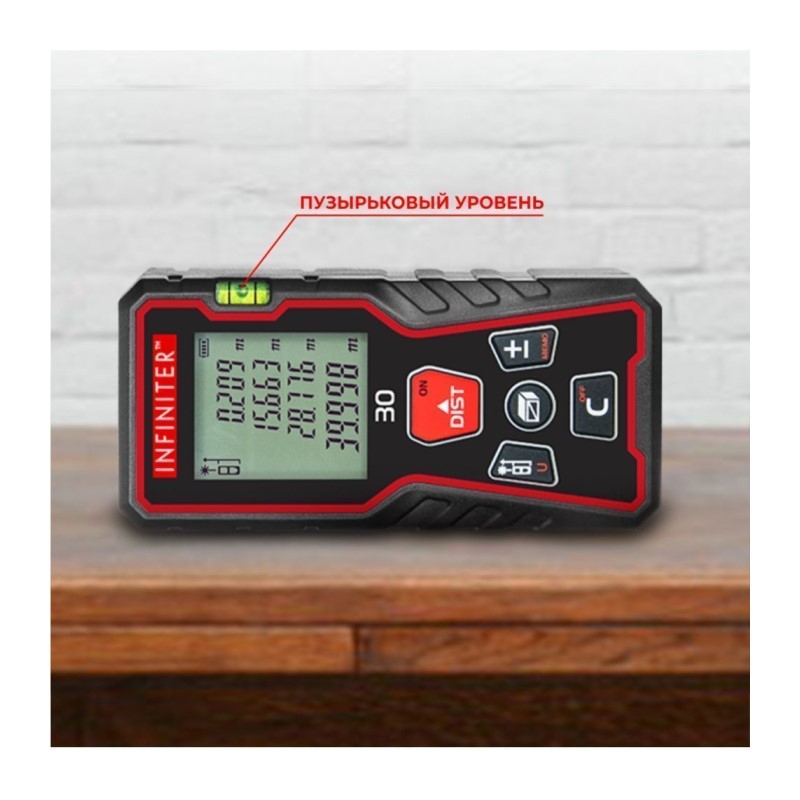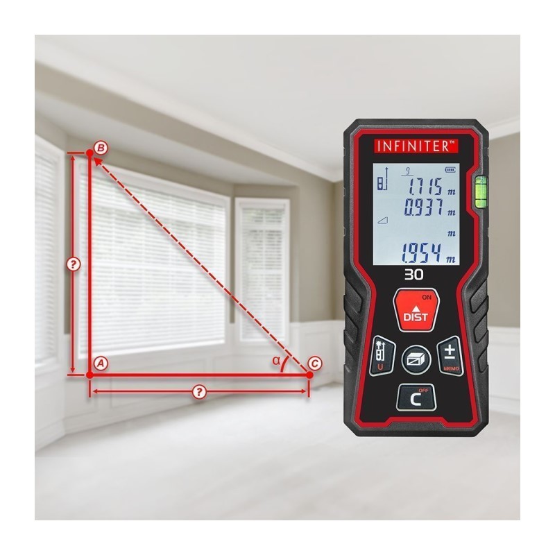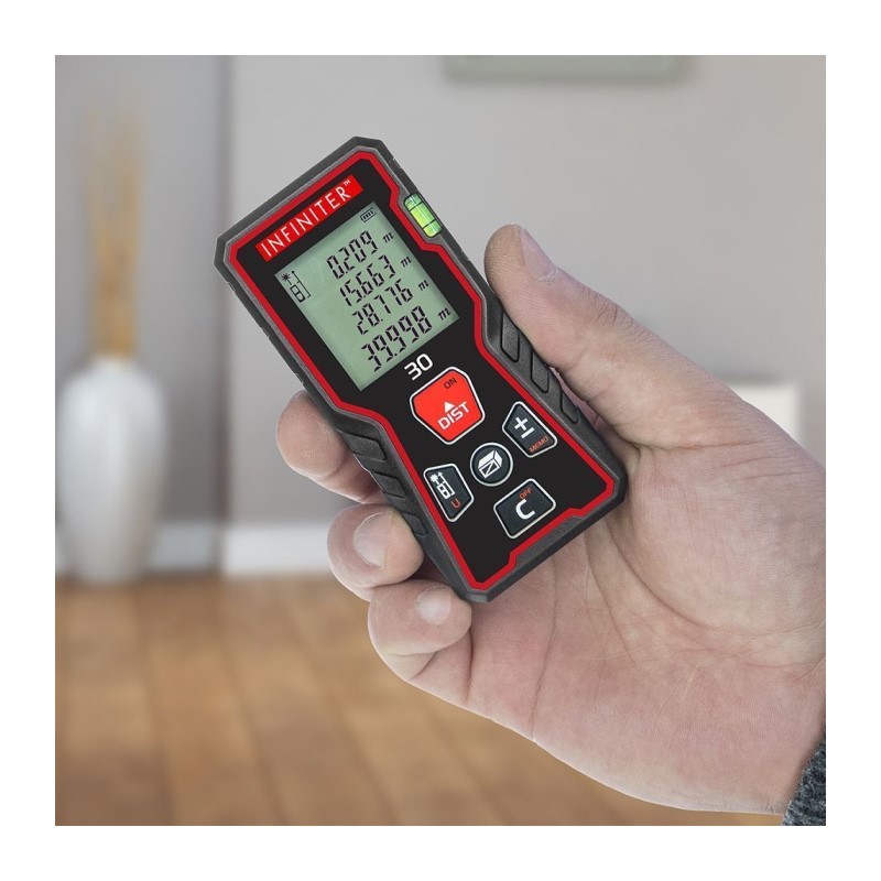 Измеряет расстояние как в помещении, так и на улице. Прибор Infiniter 30 оснащен широким набором функций, удобен в эксплуатации, имеет надежно защищенный корпус. Диапазон измерений до 30 м, наличие необходимых вычислительных функций: сложение/вычитание, определение площади и объема, косвенные измерения (по теореме Пифагора). Трекинг пригодится для проведения непрерывного измерения расстояний. Дальномер оснащен современным инверсионным дисплеем с подсветкой. На четырехстрочном экране цифры и символы будут хорошо видны как в темноте, так и в солнечную погоду.