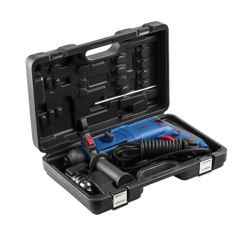• В комплекте: переходник SDS+, цилиндрический патрон с ключом, дополнительная рукоятка, ограничитель глубины сверления, запасные щетки, пластмассовый кейс.