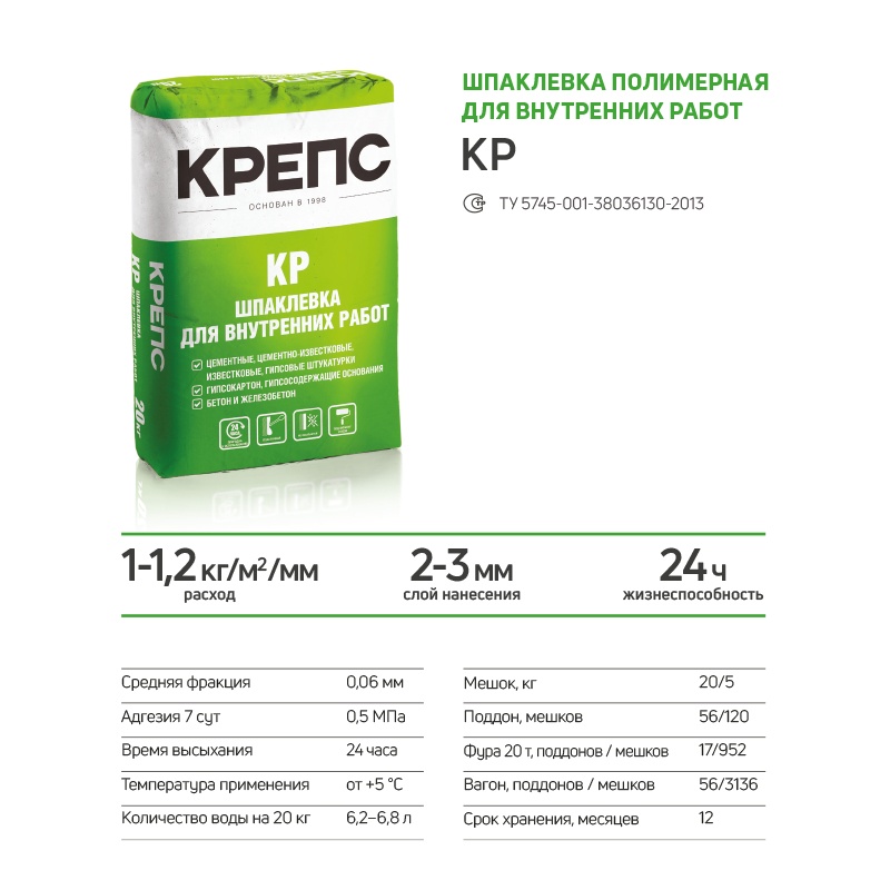 Шпаклевка полимерная Крепс КР для сухих помещений, 20 кг