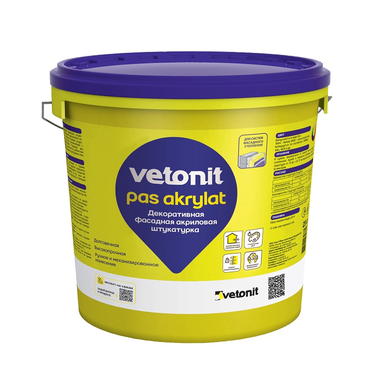 Vetonit Pas Akrylat - акриловая декоративная штукатурка для создания декоративно-защитного финишного слоя на поверхности фасада с минеральной ватой (базальтовой и кварцевой), а также пенополистиролом. Представлена в фактурах шуба и короед с размером зерна от 1,5 до 2 мм. Штукатурка Ветонит Пас Акрилат не требует последующей окраски, так как колеруется в массе в соответствии в соответствии с цветовой палитрой Vetonit Color Spectrum, RAL, NCS и другими системами. При использовании в системах с минеральной ватой (базальтовой и кварцевой) требуется произвести расчет на влагонакопление.
