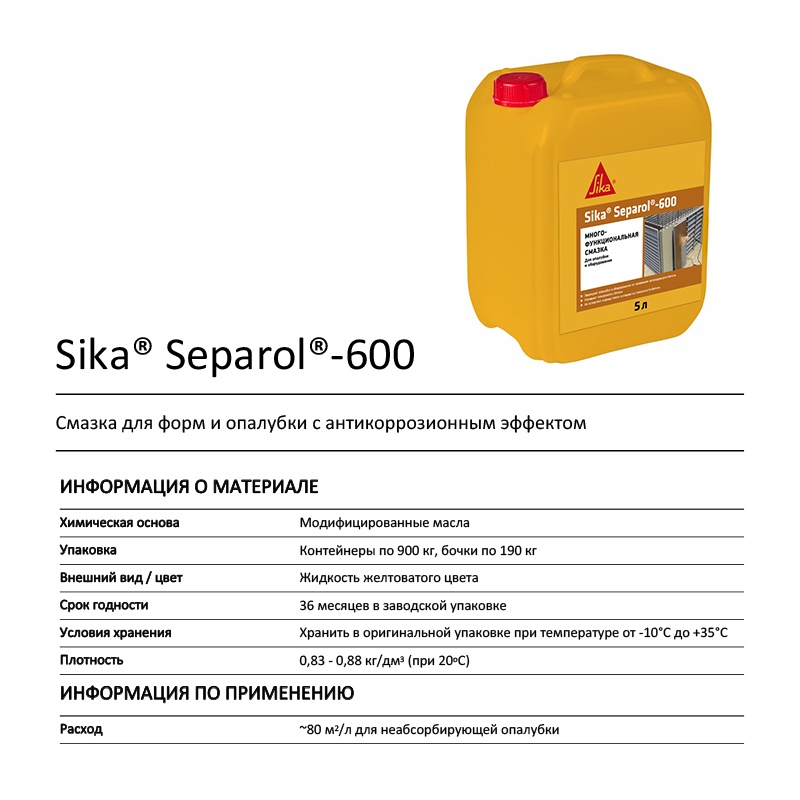 Смазка для опалубки Зика Сепарол-600 предназначена для защиты опалубки от преждевременного износа и коррозии, а также защиты элементов оборудования от налипания затвердевшего бетона. Повышает качество лицевой поверхности бетона, легкая распалубка, простота нанесения, не оставляет следов на бетоне, не содержит растворителей, защита от налипания затвердевшего бетона.