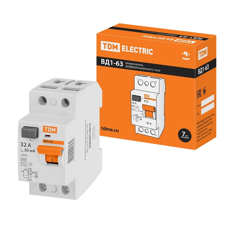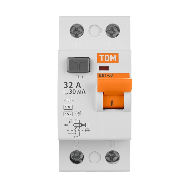 Устройство защитного отключения TDM ВД1-63, 32А, 30мА, тип АС, 2П