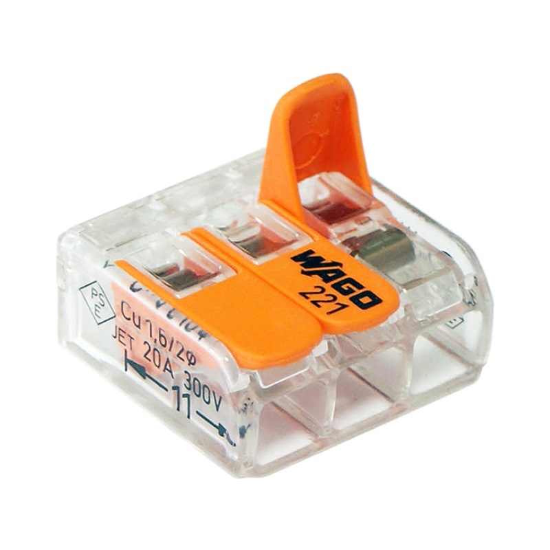 Клемма с рычажком WAGO 221-413 предназначена для: быстрого и надежного соединения и ответвления одножильных проводников от 0,2 мм² до 4 мм² и многожильных медных проводников от 0,14 мм² до 4 мм² в электрических цепях переменного тока с частотой 50 Гц напряжением до 450 В.